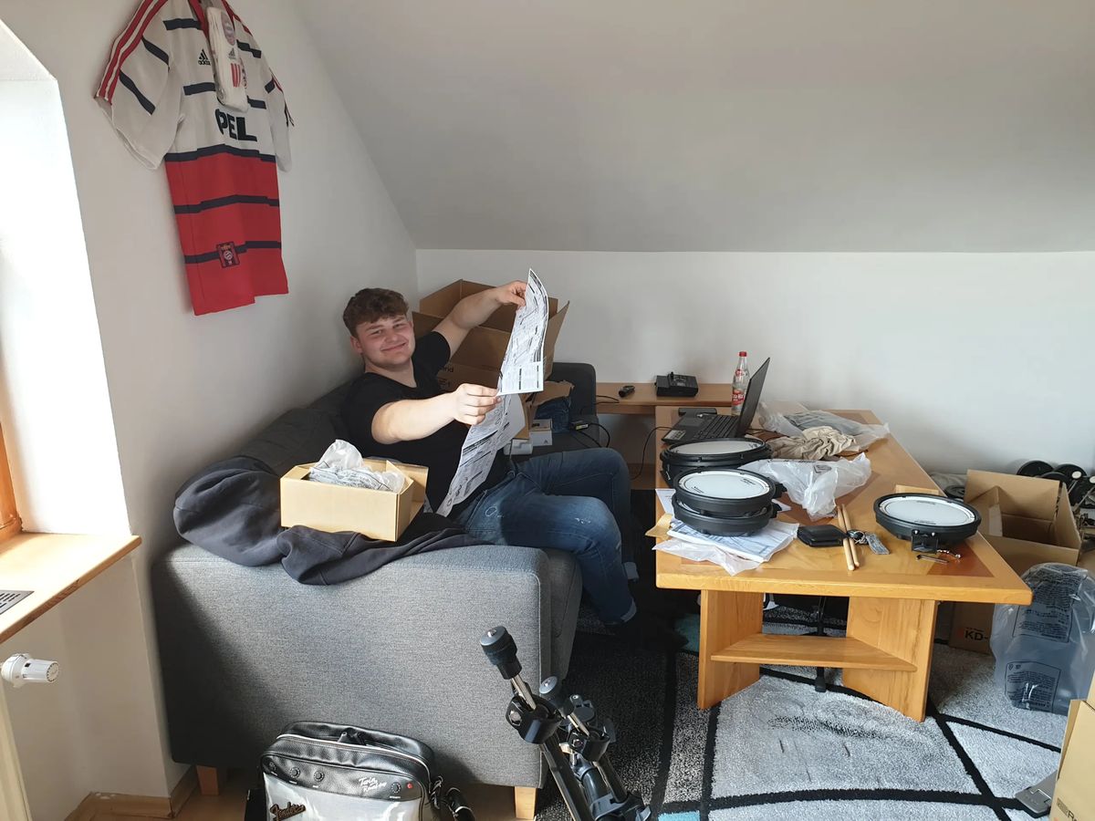 E-Bay Anzeigen, zahllose Telefonate und einige graue Haare mehr, und das in unserem Alter… Ob nun keine Räumlichkeiten verfügbar waren, oder die Preise horrende Summen annahmen, irgendwas wollte nicht, dass wir proben. Auch innerhalb der Band gab es keine Räumlichkeiten und so führte sich diese Suche weiter fort. Erst im Herbst, dann im Winter, langsam wurden die Nächte wieder kürzer und 2023 hatte uns bereits mit einem Lachen begrüßt. Zu unserem Bedauern leider ohne Probenraum im Schlepptau. Während wir uns also in der Zwischenzeit nur in kleinster Minimalbesetzung getroffen und einige Noten gespielt hatten, um nicht vollkommen einzurosten, kam mir auf einmal eine Idee. Nennen wir es „Über den Tellerrand hinausdenken“, um es schön zu formulieren. Ein freundliches „du spinnst doch“ lief mir aber auch immer wieder mal zu. Wer sich das Titelbild dieses Beitrags genauer angesehen hat, weiß was jetzt kommt… „Wenn das mit Keller und Garage nichts wird, muss hald die Wohnung herhalten“, sprach ich damals zu meinen Fragezeichen als Augen im Gesicht tragenden Band Kollegen. „Naja, mein Esszimmer ist groß. Räumen wir alles was keiner braucht raus oder in einen anderen Raum, essen kann ich am Couchtisch und das Schlagzeug kommt ans Fenster. Wenn wir uns im Kreis aufstellen, sollte das schon klappen“.
